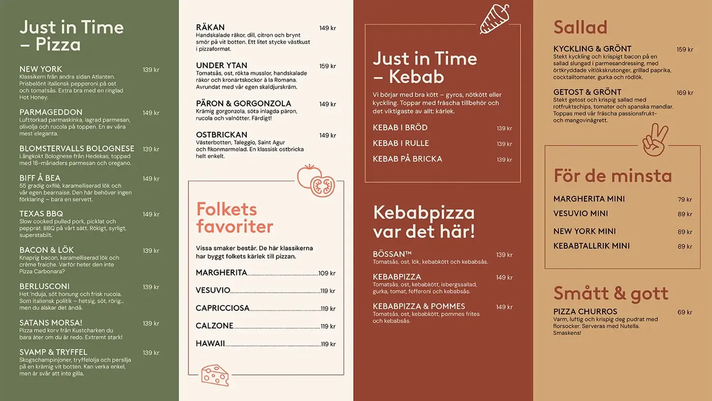 Hos Just In Time möter du den klassiska svenska pizzan i en modernare, mer påkostad version. Tunn botten, fina råvaror och smaker som verkligen lyfter. Självklart hittar du även kebab och fräscha sallader på menyn.