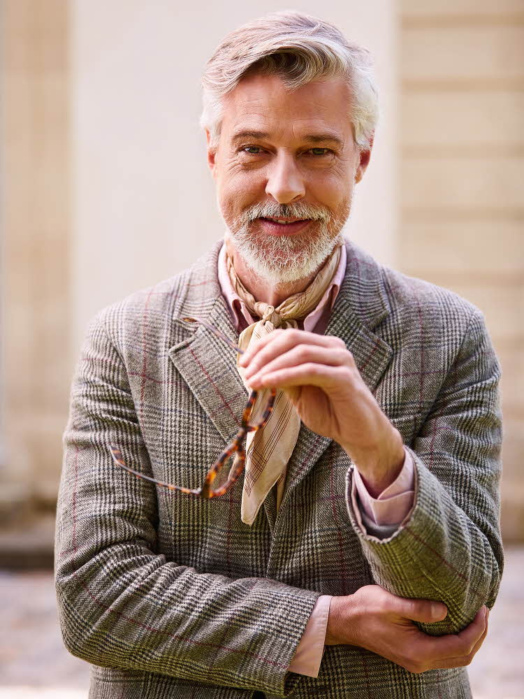 – Satsar du på en sammetskostym är en mörk färgton ett bra val, till exempel marinblå eller svart, medan tweedkavajen bland annat är fin i gråtoner.